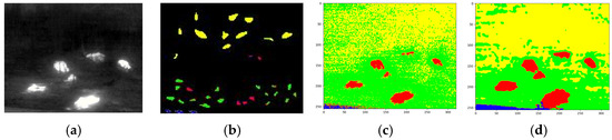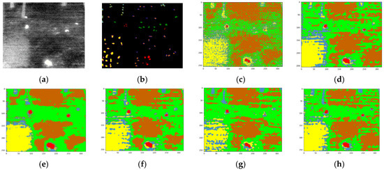 The LC dataset was captured at 18:35 on 21 December 2023, and the hyperspectral cube data are shown in Figure 10a. They consist of five targets and four types of land features. After removing the band near the 4.3 μm atmospheric absorption band, 82 bands with a pixel size of 320 × 256 remain after screening. The true value map produced using the ROI tool is shown in Figure 10b. The LC dataset corresponds to the target and land cover types, as well as the number of samples, as shown in Table 5.