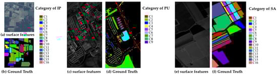 Ground cover and truth maps of IP, PU, and SA datasets. (a) surface features of IP. (b) Ground Truth of IP. (c) surface features of PU. (d) Ground Truth of PU. (e) surface features of SA. (f) Ground Truth of SA.