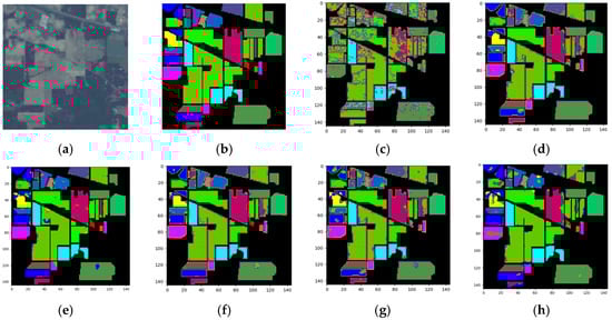 Classification and recognition results of IP dataset. (a) Surface features image. (b) True value image. (c) 1DCNN. (d) TS2DCNN. (e) 3DCNN. (f) HybridSN. (g) ResNet. (h) DACNet.
