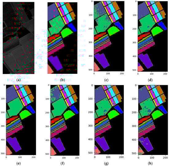 Classification and recognition results of SA dataset. (a) Surface features image. (b) True value image. (c) 1DCNN. (d) TS2DCNN. (e) 3DCNN. (f) HybridSN. (g) ResNet. (h) DACNet.