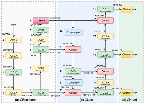 Overall structure of CV-YOLO. (a) Complex-valued backbone (CBackbone); (b) complex-valued neck (CNeck); (c) complex-valued head (CHead).