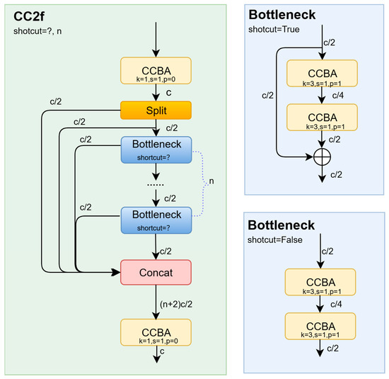 CC2f represents the complex-domain extension of the Cross Stage Partial Network with 2 Fusion (C2f) from YOLOv8. As depicted in Figure 3, the CCBA module extracts features with c channels, which are then split into two halves along the channel dimension (each with c/2 channels). One half is processed through n bottleneck modules to generate n intermediate outputs (each maintaining c/2 channels), while the other half remains unchanged. The original two halves are then concatenated with the n bottleneck outputs, followed by another CCBA module to restore the channel dimension to c. Here the value of n was set to 1. CC2f module splits the feature map into two branches: one branch preserves the original feature to avoid information loss, while the other extracts deeper features through a series of bottleneck blocks. This design reduces computational redundancy and ultimately fuses shallow and deep features via concatenation, thereby enhancing the network’s multi-scale representation capability.
