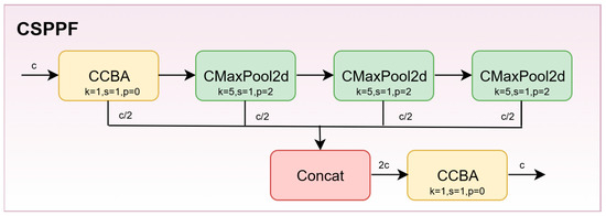 Spatial pyramid pooling (SPP) is a highly effective structure proposed by He [58], which solves the problem of extracting related repetitive features of convolutional neural networks. Building upon the SPP framework and integrating Complex-valued MaxPool2d (CMaxPool2d), we have developed the CSPPF as shown in Figure 4. By employing multiple small-sized pooling kernels in a cascading manner rather than a single large kernel, CSPPF blends feature maps of multi-scale receptive fields, thereby enriching their feature representation capability and further accelerating the processing speed.