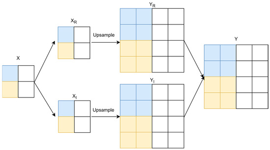 In the CNeck, we designed the complex-valued upsampling (CUpsampling) module for upsampling. CUpsampling, which scales a low-resolution image or feature map to a desired dimension, is an extension of RV upsampling techniques. It is performed with the following calculations: