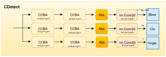 As depicted in Figure 6, CDetect employs three distinct branches that receive inputs from the CBackbone and CNeck. It further refines the complex-valued features via two CCBA modules. Subsequently, the complex-valued features are translated into real domain by the Abs layer, culminating in the processes of target recognition, bounding box regression for predictions, and rotation angle estimation. The CHead predicts five parameters: x, y, w, h, and θ. Here, (x, y) denotes the center coordinates, w and h are scaling factors relative to predefined anchor box dimensions across different feature maps, and θ represents the rotation angle. The anchor boxes that most closely match the ground truth boxes are identified through IoU calculations. Since the labels are in the real domain, we convert the outputs to real values for loss computation.