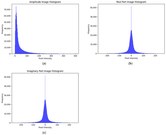 Gaussian filtering is a prevalent image smoothing technique employed to mitigate noise and reduce high-frequency image details. Histogram analysis was conducted on the images within the CSRSDD dataset, as presented in Figure 7. The observed distribution suggests that noise present in SAR images can be approximated by a Gaussian distribution. Thus, we aimed to extend Gaussian filtering into the complex domain to effectively remove noise. For a real-valued signal , in which represents the standard deviation, a Gaussian filter can be represented as follows: