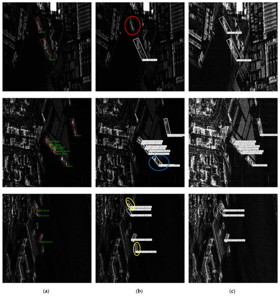 These algorithms are all based on horizontal bounding boxes (HBBs). However, ships in SAR images usually have large aspect ratios and arbitrary direction, and HBBs cannot accurately surround the target and tend to introduce a lot of background information, particularly in near-shore scenarios with densely berthed ships. Furthermore, there is a lot of overlap between HBBs, which brings great difficulties to detection. Oriented ship detection with oriented bounding boxes (OBBs) has become a research focus [32]. An et al. [33] used OBBs to address the issue of excessive parameters in traditional CNN models. Chen et al. [34] developed a multi-scale architecture based on OBBs to handle the arbitrary orientation of SAR ships. Chen et al. [35] and Yang et al. [36] presented transformer-based single-stage methods for oriented SAR ship detection. Huang et al. [37] further advanced YOLOv11 by integrating an attention mechanism to enable high-performance oriented ship detection in SAR images.