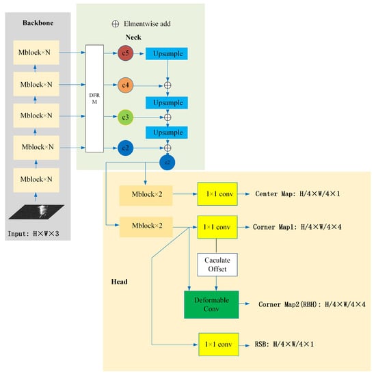 In TPNet, a ship is represented using three critical points: the center point, the left-top corner, and the right-bottom corner, as depicted in Figure 2. The input image has dimensions , and the Lightweight MBlock Network (MNet) is utilized to extract high-level features from this image. The feature maps produced by MNet are subsequently processed by the Neck module, which performs fusion operations to generate a final feature map of size . Here, denotes the downsample ratio, which is set to 4 and will be elaborated upon in Section 4.2.1. This feature map is then passed to the Head, which outputs 3 maps: a center map and two corner maps. The center map is a heatmap used to locate the center of the target ship, while the corner maps compute the distances from the center point to the upper-left and lower-right corners of the bounding box. Additionally, the RSB module generates a rescoring map to further refine the center map’s output.