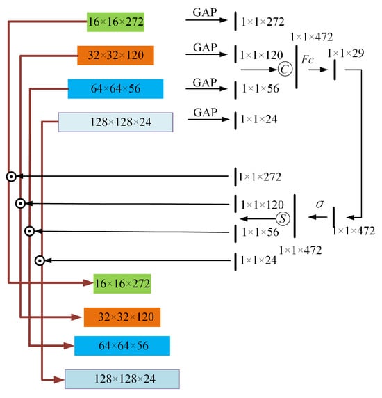 As illustrated in Figure 3, MBlock consists of five key components: Conv1, Conv2, Conv3, Conv4, and the attention block. Conv1 is composed of a PW convolutional layer, a batch normalization (BN) layer, and an activation function layer, with the hard-swish function utilized as the activation function. The Conv2 layer is constructed using a sequence of DW convolutions with different kernel sizes, each followed by a BN layer. The output features from these DW-BN layers are aggregated through summation and subsequently passed through an activation function for refinement. Conv3 includes a PW convolutional layer and a BN layer, which are employed to adjust the channel dimensions of the output features. Conv4 functions as a downsampling layer, consisting of a convolutional layer and a BN layer. The Attention Block is a WSE Layer, which will be further detailed in Section 2.6.