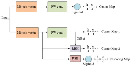 In TPNet, the head component is composed of two distinct branches: the classification branch and the regression branch, as depicted in Figure 7. The classification branch produces the center map, which estimates the confidence score for each point, thereby determining the score assigned to the predicted bounding box at that location. The regression branch generates three outputs: corner map 1, corner map 2, and the rescoring map. The corner maps provide positional information for the predicted bounding boxes, while the rescoring map refines the center map’s predictions. Unlike CenterNet, TPNet determines the bounding box by predicting the horizontal and vertical distances from the center point to the upper-left and lower-right corners of the predicted box, as illustrated in Figure 2.