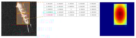 A target ship and its corresponding heatmap in the center map (the table parameters are derived from the true labels downsampled at a rate of 4, as calculated using Equation (6). The heatmap is generated based on these table parameters).