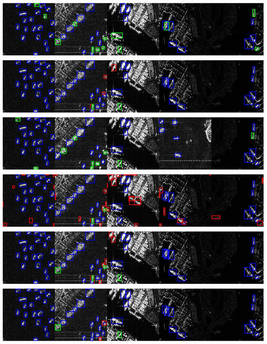 Synthetic Aperture Radar (SAR) technology, with its active microwave sensor, has emerged as a valuable tool in marine science due to its ability to operate effectively in all weather and lighting conditions. Since the launch of the SEASAT1 satellite by the United States in 1978, SAR technology has been widely utilized, and many countries have launched their own SAR satellites, leading to a surge of interest in the processing of SAR images. In particular, ship detection algorithms for SAR images have emerged as a significant research focus in remote sensing, attracting growing attention from researchers and practitioners dedicated to developing advanced detection techniques. Traditional ship detection algorithms generally employ a sliding window approach to partition an image into smaller regions. Within each region, hand-crafted features such as HOG [], LBP [], DoG [] or SIFT [] are extracted. Subsequently, a classification algorithm, typically a Support Vector Machine (SVM), is applied to ascertain the presence of a ship within each region. For example, Gan et al. [] utilized a continuous interval rotating sliding window and HOG features to locate ships. Lin et al. [] put forward a compact and effective feature named MSHOG, which can be computed by four steps to classify ships in SAR images. Wang et al. [] proposed a detector based on DoG to detect ships in Radarsat-2 ScanSAR data. Guo et al. [] utilized SIFT operator and Spatial Pyramid Matching to detect ships in optical images. In addition, the Constant False Alarm Rate (CFAR) is also frequently used in SAR ship detection. For instance, Leng et al. [] put forward a bilateral CFAR algorithm, which combined the intensity distribution and spatial distribution of SAR images to reduce the impact of SAR ambiguity and sea clutter; Wang et al. [] proposed an Intensity-Space Domain CFAR algorithm to detect ships in HR SAR images. However, traditional ship detection methods cannot extract advanced semantic information from images, resulting in unsatisfactory detection accuracy.