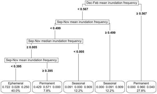 CART models were used to develop inundation frequency thresholds among permanent, ephemeral and seasonal functional groups. The variables driving the splits at each node are displayed on the left, along with the numerical thresholds that separate the wetland types. These rules cumulatively defined the final thresholds, shown at the bottom for each wetland type: ephemeral, permanent and seasonal. The bubbles at the bottom indicated the proportion of each class within a node and the overall percentage of data attributed to that wetland type. For instance, in the far-right bubble, the threshold accounted for 27.8% of the total wetlands, with 96% classified as permanent, 4% as seasonal and none as ephemeral.