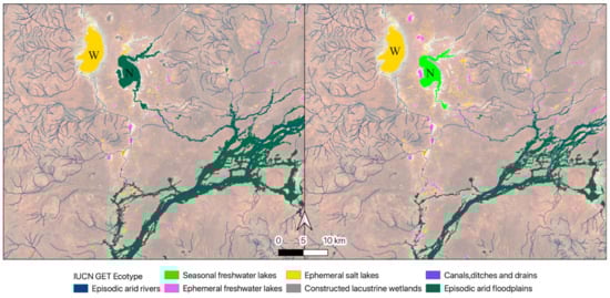 Temporal variation in classification in 2003–2008 (left) and 2019–2024 (right) of Lakes Numalla (seasonal freshwater lake, N) and Wyara (ephemeral salt lake, W) and other wetlands in the Paroo–Warrego region, resulting from classification and mapping using our thresholds for IUCN GET ecosystem functional groups.