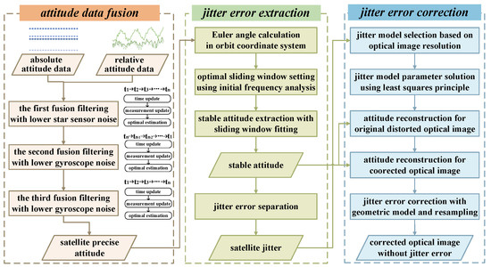 Flowchart of optical satellite jitter error correction with multi-source attitude data fusion.