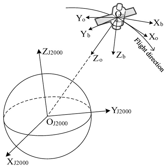 Based on the orbit measurement data, the satellite position and velocity at time can be obtained. The attitude rotation matrix from to can be derived using the following equation [35]: