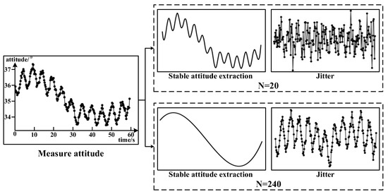 The satellite attitude can be regarded as the composition of the stable attitude and jitter error. To correct the jitter error, the satellite stable flight attitude (small numerical changes without periodic fluctuations) should be separated first. As shown in Figure 4, when the size of stable attitude extraction window is too small, some jitter data are incorrectly extracted, resulting in jitter error data without periodic characteristics. Conversely, the details of stable flight attitude cannot be expressed well using the large extraction window. To address this problem, a stable attitude exaction and jitter separation method based on Fourier transform and sliding filtering is proposed.