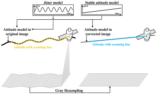 As shown in Figure 5, when affected by satellite jitter, linear scanning imaging will result in image misalignment and geometric distortion. However, when the satellite attitude is stable without jitter errors, optical images with high internal geometric accuracy and no distortion can be obtained. To correct the optical image of HY-3A, resampling using a geometric model and stable attitude is adopted [37,38,39].