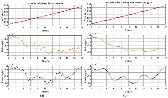 Satellite attitude parameters: (a) Euler angles determined by star sensors, (b) Euler angles determined by star sensors and gyroscope fusion.
