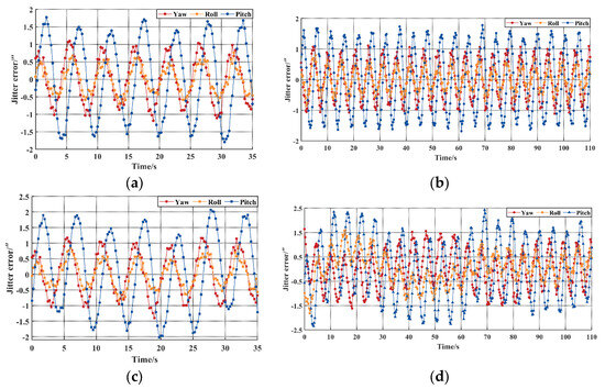 To compare the applicability of the proposed method under different time ranges, attitude data within 35 s and 110 s are selected. For the attitude data within 35 s, the extracted jitter errors with the sliding fitting are similar to the overall fitting, as shown in Figure 8a,c. The satellite flight attitude is relatively stable and can be expressed using the overall cubic polynomial model in a relatively short period of time. For the attitude data within 110 s, extracted jitter errors with the sliding fitting reveal a certain periodicity, as shown in Figure 8b. However, using the overall fitting, the stable component cannot be removed from the fusion attitude, and the jitter error cannot be separated well, as shown in Figure 8d. The details of stable flight attitude cannot be expressed well by the overall fitting for a relatively long period of time. The sliding fitting window for stable attitude is calculated using the frequency of the jitter error, which can accurately separate jitter errors without the interference of stable flight attitude.