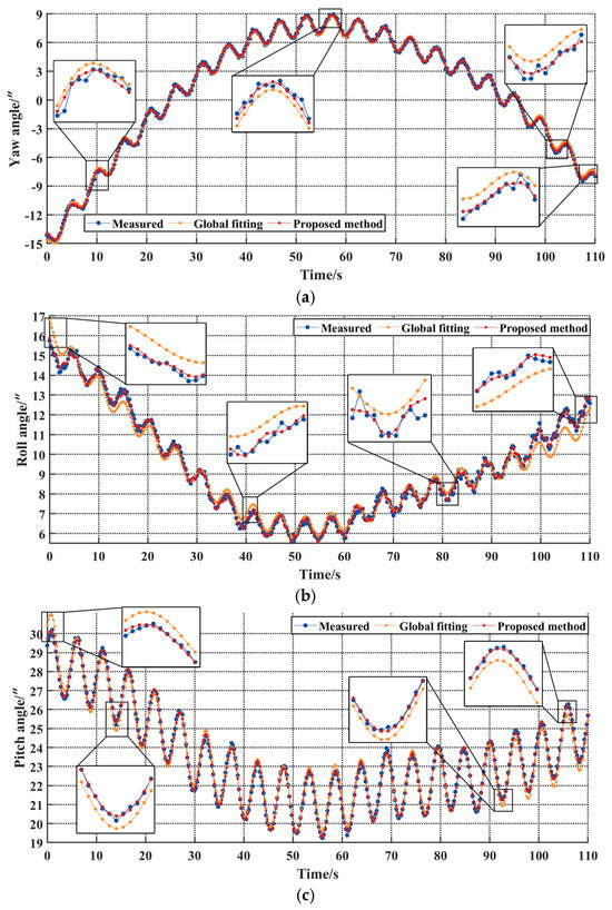 The attitude reconstruction results within 110 s are shown in Figure 9. The blue, yellow, and red dots represent the fused attitude, the reconstruction results based on overall fitting of stable attitude, and the reconstruction results obtained with the proposed method, respectively. During imaging, the stable roll attitude angle ranges from 6″ to 17″ arcseconds, and the stable pitch attitude angle ranges from 19″ to 30″ to ensure the imaging region is captured. When affected by jitter, in addition to maintaining a stable attitude, there are also periodic fluctuations. The reconstruction results obtained using the proposed method demonstrate consistency with the fused attitude. Furthermore, fluctuations in fused attitude caused by the gyroscope noise are effectively removed through application of the proposed jitter error model and least squares solution. Although the reconstructed results based on overall fitting of stable attitude exhibit good smoothness, they show significant deviation from the fused attitude. These findings demonstrate that the proposed method successfully eliminates measurement noise and accurately characterizes jitter errors.