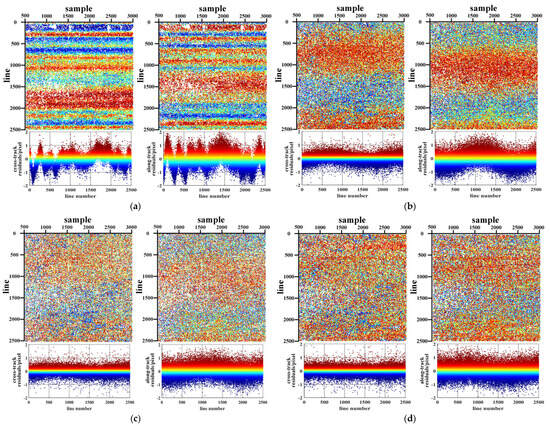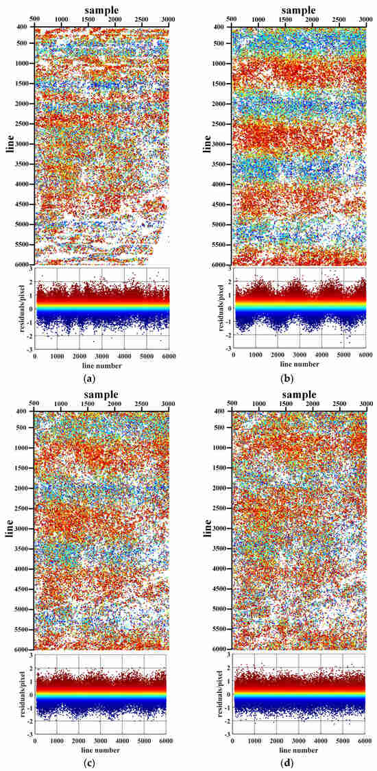 Residuals of optical image registration along the track direction: (a) attitude determined by star sensors, (b) attitude determined by stable attitude, (c) attitude determined using the conventional sliding method, (d) attitude determined by star sensor and gyroscope fusion.