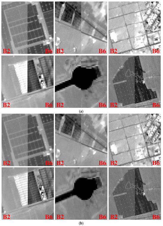 The registration results of typical ground targets are shown in Figure 12. Under jitter error interference, significant target misalignment occurs in ground observations. After implementing the proposed method, multispectral image registration accuracy demonstrates substantial improvement, with visual misalignment being effectively eliminated. This methodology successfully corrects geometric distortions induced by jitter errors, thereby preserving the application value of HY3A optical imaging data.