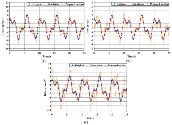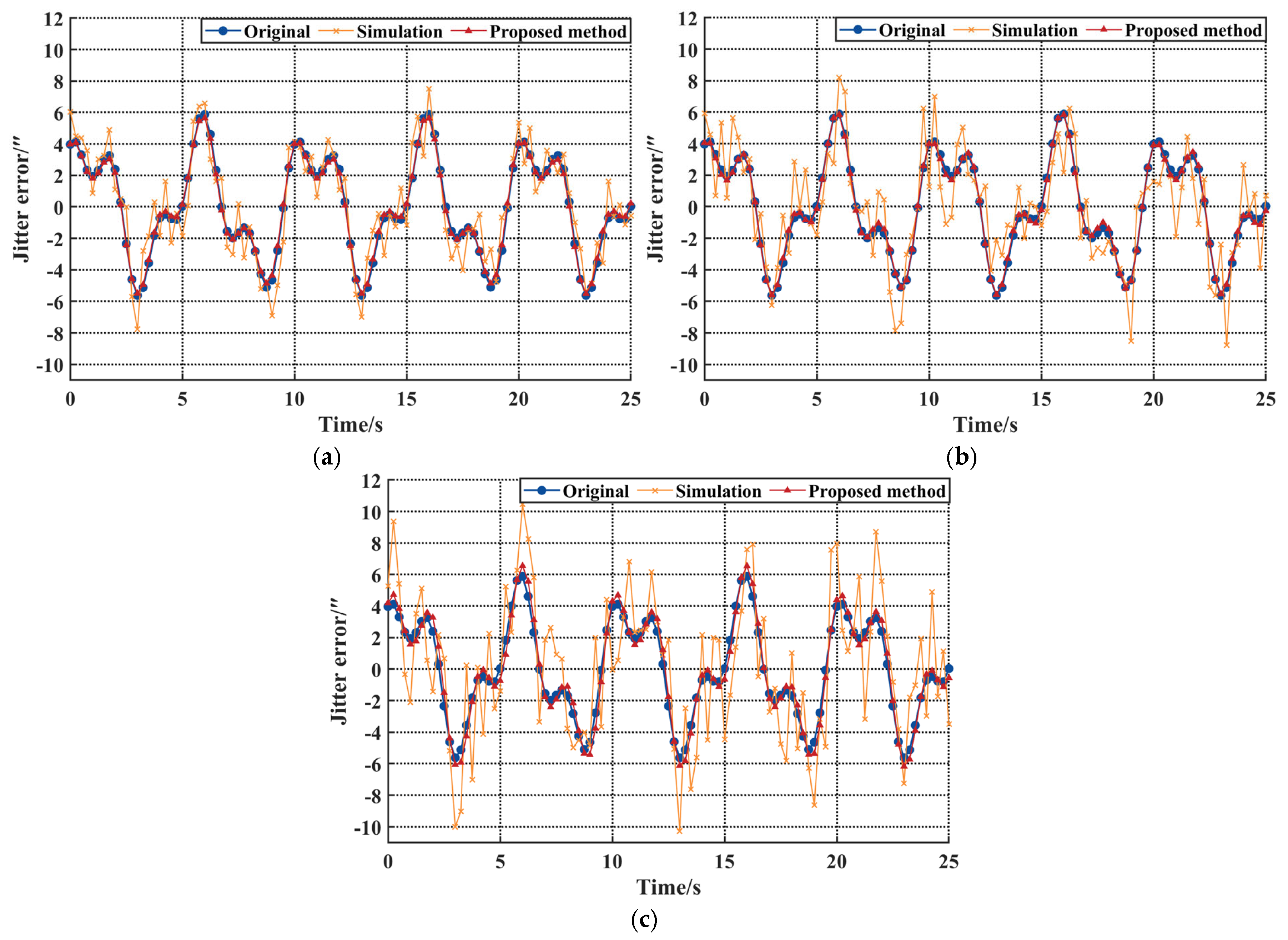 Modeling results of jitter error under different noise levels: (a) 1.444″, (b) 2.295″, (c) 3.179″.