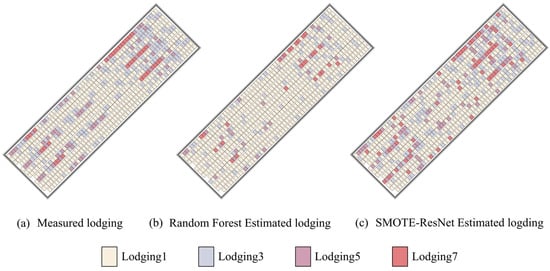 - In the context of imbalanced lodging class samples, the minority class initially exhibited low classification accuracy. However, incorporating the SMOTE module into the framework significantly improved the accuracy of the minority class. This enhancement resulted in more balanced classification outcomes across various lodging levels, enhancing the model’s capability to effectively identify lodging samples.