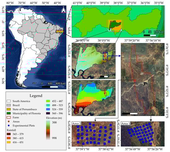 Geographic location and spatial distribution of the sample units at Fazenda Itapemirim, municipality of Floresta, PE, Brazil.