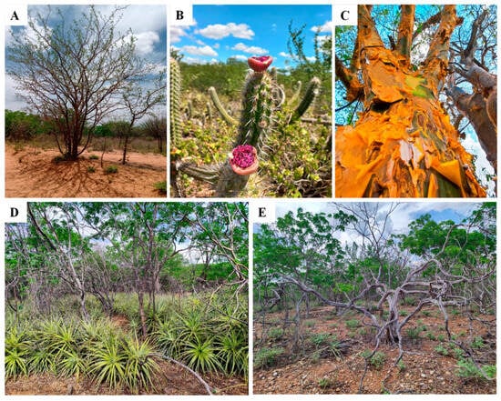 The vegetation in the area is shrubby–arboreal, with the occurrence of trees with multiple stems, cacti, herbaceous strata, and bromeliads, such as Bromelia laciniosa Mart. ex Schultes f. and Neoglaziovia variegata (Arr. Cam.) Mez., as well as species such as Commiphora leptophloeos (Mart.) J.B. Gillett, used by traditional populations to make handicrafts (Figure 2). The occurrence of deciduous species is also observed, a typical phytogeographical feature of a wooded steppe savanna [].