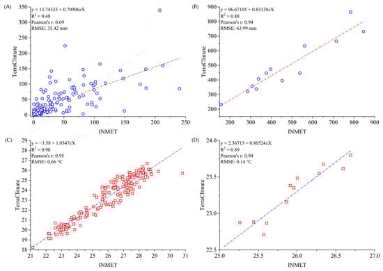Validation of observed data (INMET) with estimated data (TerraClimate) for monthly (A) and annual (B) rainfall and monthly (C) and annual (D) mean air temperature between the years 2011 and 2021.