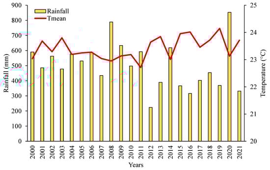 3.2. Annual Rainfall and Temperature Dynamics from 2000 to 2021