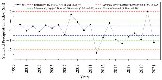 3.3. Standardized Precipitation Index (SPI) Monthly from 2000 to 2021