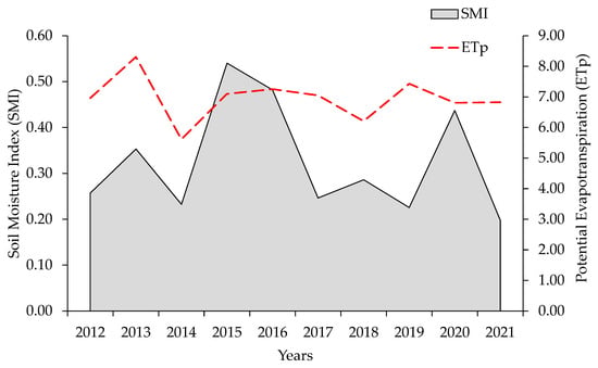 The interannual variation of the soil moisture index (SMI) and the potential evapotranspiration (ETp) for the 2012–2021 time series is presented in Figure 6. The SMI values are shown on the left vertical axis, ranging from 0.00 to 0.60, while the right vertical axis displays the ETp values, with a scale from 0.00 to 9.00 mm year−1. The year 2015 corresponds to the year with the highest soil moisture observed in the experimental area. However, moisture incidence is noted for the experimental areas of the farm, as the ETp rates are relatively high, approaching 7 mm year−1.