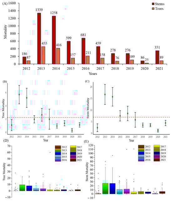 It is important to note that for the calculation of tree and stem mortality rates in individuals with multiple stems, mortality was assessed at the individual level, defined as the death of all stems of a given tree. For example, if a tree had 10 stems, it was considered dead only when all 10 stems were dead. In the mortality analysis, only the mortality of individual trees was considered, while stem mortality was evaluated based on the total number of stems of each tree.
