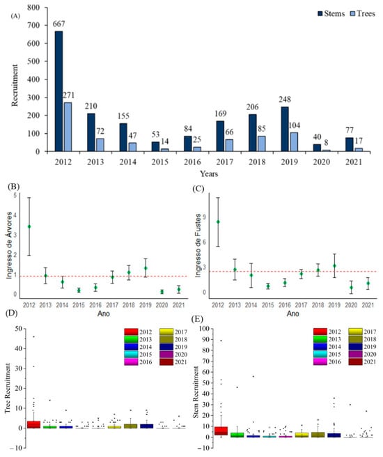 Mortality and recruitment of 513 and 361 trees were recorded in the period from 2012 to 2021 in Area I. Mortality for stems was 1430, while recruitment was 1054 stems. A total of 1270 trees and 4083 stems died in Area II over the 10-year period, respectively, and a total of 348 trees and 855 stems were recruited (Table 2). Overall, there was a gradual decrease in tree density from 2118.5 to 1447.5 trees.ha−1, as well as a reduction from 5917.5 to 3665 stems.ha−1, respectively, corresponding to a loss of 68.33% of trees and 61.93% of stems between 2012 and 2021. The high loss percentage of trees and stems of the species in the mentioned areas coincides with the period of reduced annual rainfall and high mean temperatures (Figure 4), which may have resulted in higher evapotranspiration rates and, consequently, a negative water balance. In this sense, when evaluating the influence of climate on the dynamics of forest carbon accumulation in dry tropical forests in Costa Rica and Brazil, Calvo-Rodrigues et al. [] found a significant correlation between seasonal climate variables such as temperature, rainfall, and potential evapotranspiration and annual mortality and carbon loss in forests, corroborating the results of the present study.