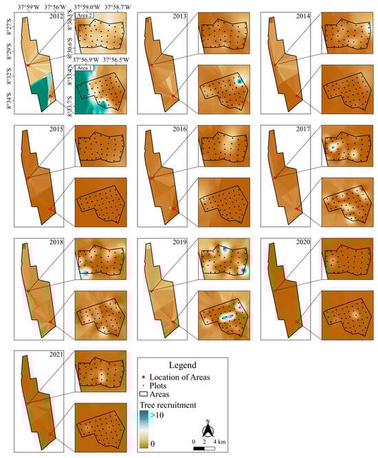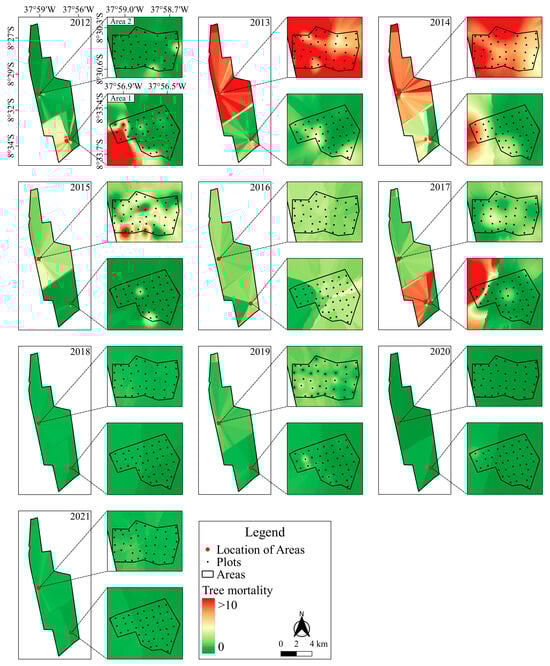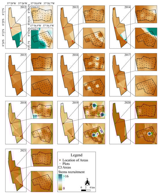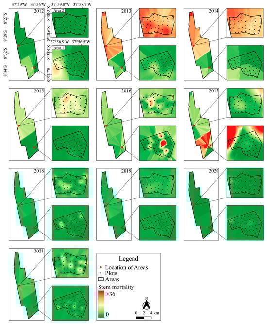 Therefore, understanding changes in tree mortality and recruitment rates in the Caatinga over the years is essential for developing predictive models of dynamics and for sustainable forest management for production. Thus, the objective of this study was to characterize the annual patterns of mortality and recruitment of stems and trees between the years 2012–2021 in a Caatinga remnant in the state of Pernambuco, Brazil, through geostatistical modeling, as well as to associate drought events recorded in the region based on the SPI with vegetation dynamics.