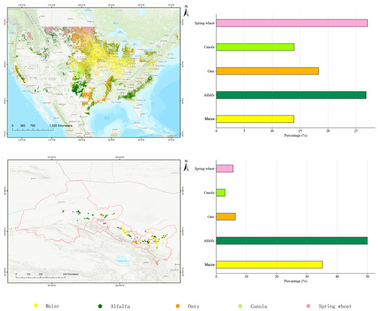 For the mapping task, we selected five crop types in both the source and target domains: maize, alfalfa, oats, rapeseed, and spring wheat. The spatial distribution, quantity, and proportion of the samples are shown in Figure 2 and Table 1.