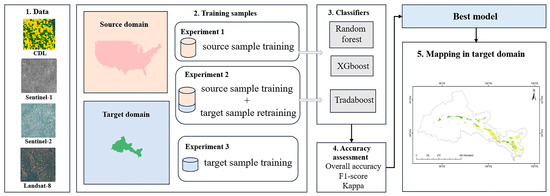 We selected several machine learning algorithms, including Random Forest, XGBoost, and TrAdaBoost, as strategies for the transfer-learning-based crop classification task.