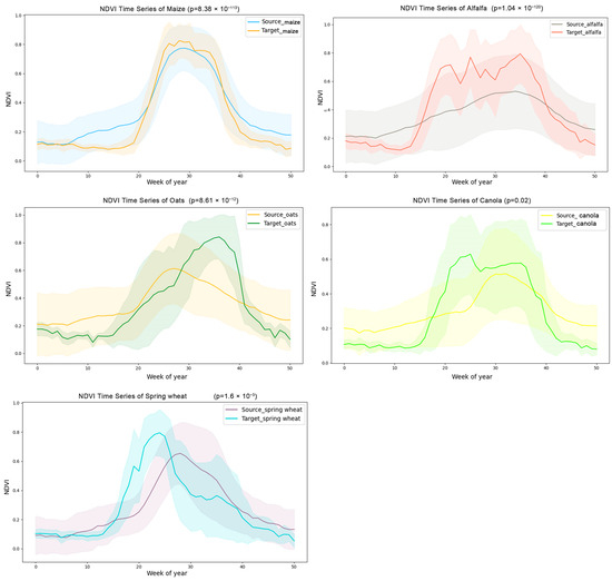 Averaged NDVI weekly time series for each crop type for source domain and target domain, with x-axis representing image compose dates and y-axis representing vegetation index value.