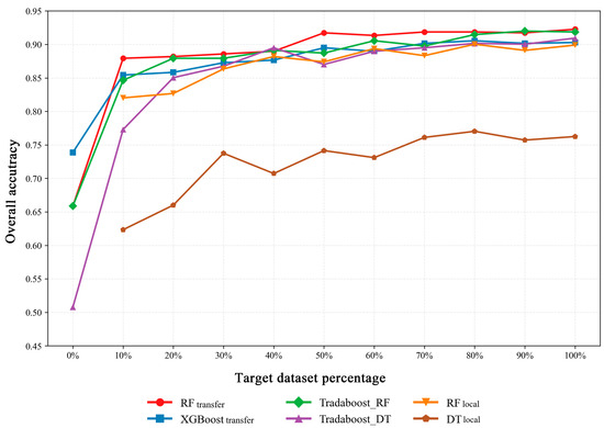 Specifically, the overall accuracy of RFtransfer increased from 87.93% to 92.26%, XGBoosttransfer improved from 85.43% to 90.29%, Tradaboost_RF rose from 84.56% to 91.86%, and Tradaboost_DT increased from 77.30% to 90.94%. Similarly, RFlocal and DTlocal also demonstrated a gradual improvement in accuracy with the addition of target domain data, with RFlocal improving from 82.02% to 89.90% and DTlocal increasing from 62.34% to 76.25%. However, their performance remained lower than that of the models utilizing the transfer learning strategy in Experiment 2.