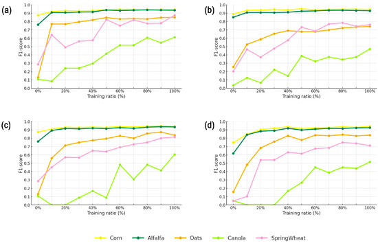 In the classification performance for each crop, Figure 6 shows the performance of the original models as well as the models that incorporate target domain data on the target domain test set. Maize and alfalfa exhibit relatively high F1-scores in the original models, with values of 0.8743 and 0.7618 (RFnaive), 0.8897 and 0.8523 (XGboostnaive), and 0.749 and 0.6175 (DTnaive), respectively, while other crops show relatively lower F1-scores in the original models. As target domain data are incorporated, there is an overall increase in the F1-scores for various crops, with particularly noticeable improvements for oats, canola, and spring wheat. By the final stage, after incorporating the entire target domain training data, the F1-scores for different crops reached above 0.93 for maize and alfalfa, over 0.85 for oats and spring wheat, and the lowest for canola at 0.61.