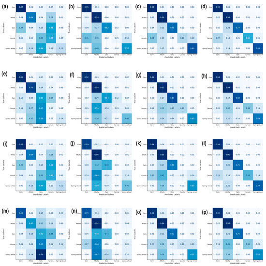 The confusion matrix reveals the specific misclassification patterns of crop categories, as shown in Figure 7. The rows from the first to the fourth represent the four transfer learning algorithms, and from left to right, the matrices display the confusion results when 0%, 10%, 50%, and 100% of the target domain data are used for transfer. These represent the beginning, middle, and end stages of incorporating target domain data. From Figure 7, it can be observed that when only source domain data are used for training, maize and alfalfa show higher accuracy, while other crops are poorly classified, resulting in significant misclassification. When 10% of the target domain data are added for retraining, the misclassification between oats and canola is resolved, and the classification accuracy for oats begins to improve. However, canola and spring wheat are still mainly misclassified as major crops (such as alfalfa and maize). As more target domain data are gradually incorporated (50–100%), this misclassification is notably corrected, leading to improvements in the classification accuracy of both canola and spring wheat.
