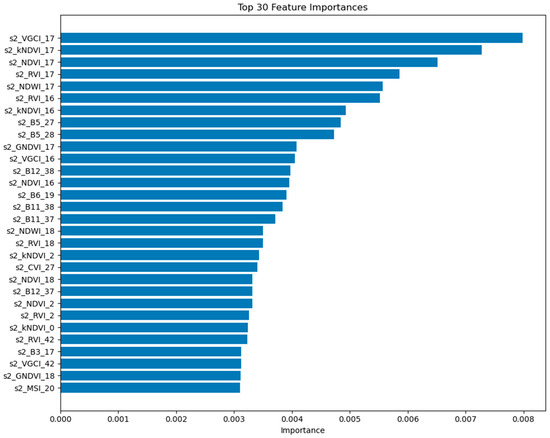 Differences in crop phenology provide valuable information for crop mapping, and satellite images with time series can effectively capture these phenological characteristics. Vegetation indices are commonly used to qualitatively assess vegetation coverage and vigor [56]. In agricultural applications, they are commonly applied in crop type identification, crop growth monitoring, and related tasks. In this study, we used 16 vegetation indices as features, as shown in Table A2, calculated from the Sentinel-2 and Landsat-8 bands. Additionally, all bands from Sentinel-2 and Landsat-8, along with the VV and VH polarization modes from Sentinel-1, were utilized as input features.