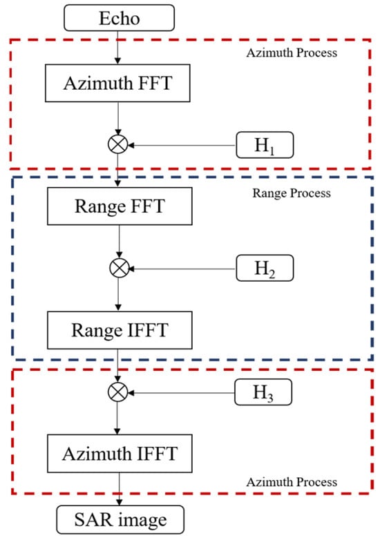 The flowchart of the CS algorithm for imaging is shown in Figure 1. The three phase multiplication factors in the figure, , , and , represent the chirp scaling factor, the range migration correction and range compression factor, and the azimuth compensation factor, respectively. The specific calculation methods for these three factors are provided in Section 2.3.