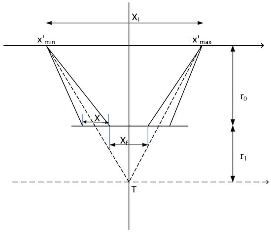 The imaging geometry model of the spaceborne sliding-spotlight synthetic aperture radar (SAR) is shown in Figure 2. The SAR sensor moves along the axis from to , with the beam center consistently pointing towards the virtual steering point T during this period. represents the azimuth swath width of the scene fully illuminated by the beam. denotes the shortest range between the scene center and the SAR platform, while denotes the shortest range between the scene center and the virtual steering point T. Referring to the imaging geometry, the slant range of the center point in the imaging scene is