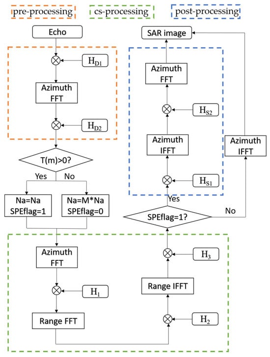 Based on the CS algorithm [], the Deramp preprocessing operation reduces the azimuthal Doppler bandwidth and increases the equivalent PRF, thereby resolving the issue of azimuthal spectral aliasing [,,,]. By performing azimuth zero-padding after preprocessing or SPECAN post-processing at the end of the algorithm [], the issue of time-domain aliasing in the imaging results can also be resolved. The main steps of Deramp and SPECAN processing both involve chirp scaling and time–frequency transformation. As a result, this algorithm only requires fast Fourier transform (FFT) and complex multiplication operations, which reduces the computational complexity.