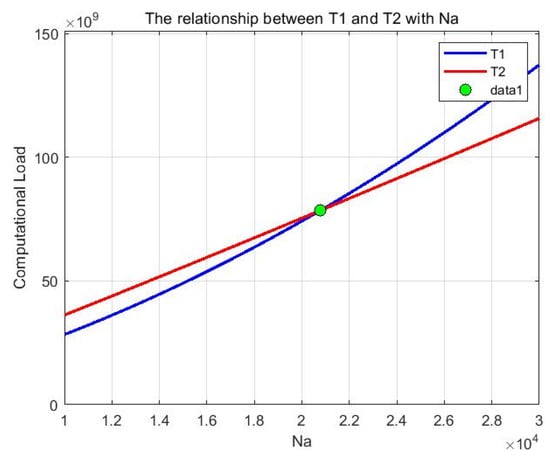 To provide a more intuitive comparison of the computational loads between the two algorithms under varying data sizes, Figure 4 illustrates the variations of and with under simplified conditions. Since this study focuses on azimuth processing, can be fixed at 10,000, and the relationship between the zero-padding multiple and is simplified by assuming a linear correlation. Specifically, as increases from 10,000 to 30,000, linearly rises from 1 to 1.5. Figure 4 reflects, to some extent, the distinct applicable scenarios of the two algorithms.