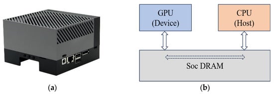 The NVIDIA Jetson AGX Orin is classified as a system-on-module (SoM), which primarily belongs to an integrated architecture. In discrete architectures, the CPU and GPU are independent, with the GPU having its own dedicated memory. In contrast, in integrated architectures, the CPU and GPU share the same memory, which greatly speeds up data transfer between the CPU and GPU during batch processing. Furthermore, it uses a GPU based on the Ampere architecture with up to 2048 CUDA cores and 64 Tensor cores, and its CPU is an ARM Cortex-A78AE with 12 cores (Infineon, Neubiberg, Germany), which is designed by ARM Holdings, a semiconductor and software design company headquartered in Cambridge, United Kingdom. The integration of all these components makes it highly efficient. With 64 GB of LPDDR5 memory and a bandwidth of 204.8 GB/s, it is capable of processing much larger scale data. Figure 5a is the image of the AGX Orin, and Figure 5b is the schematic diagram of the integrated architecture.